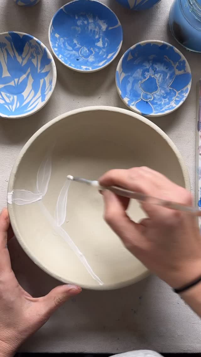 Handmade porcelain ceramics with classic blue and white designs inspired by seasonal plants in the South.